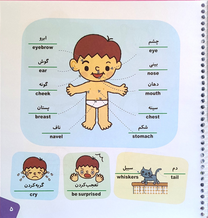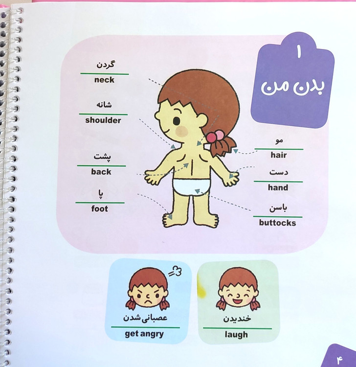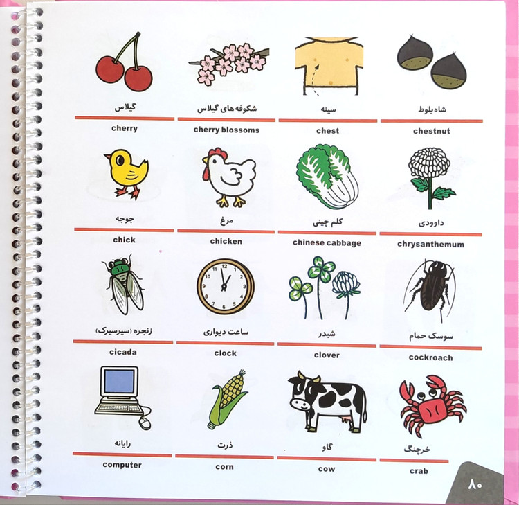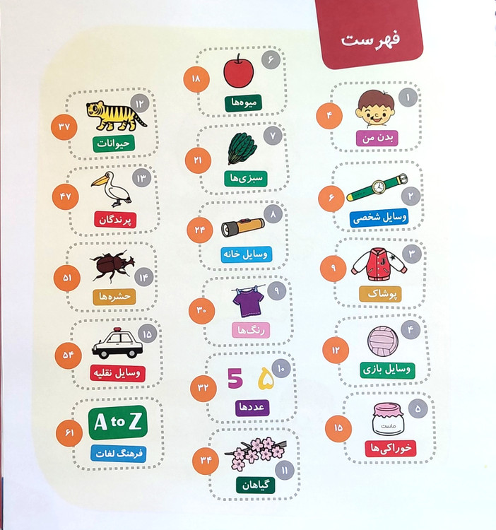 واژهها در موضوعات متنوع دستهبندی شدهاند: بدن من، پوشاک، خوراکیها، وسایل نقلیه، حیوانات، رنگها، اعداد و غیره.