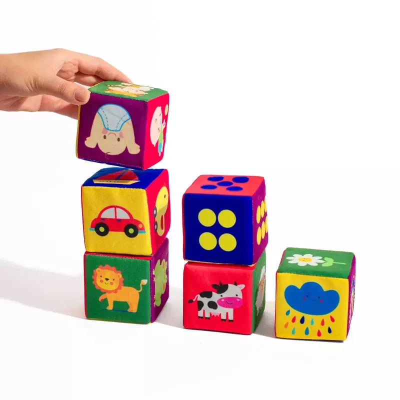 هر بسته شامل ۶ مکعب پارچهای سبک است که در میان آنها چند مکعب دارای جغجغه داخلی هستند و با ایجاد صدا باعث تحریک حس شنوایی و افزایش توجه کودک میشوند. سایر مکعبها ساده بوده و برای بازیهای دیداری و حرکتی مثل رویهمچیدن، شناخت رنگها و حیوانات کاربرد دارند.