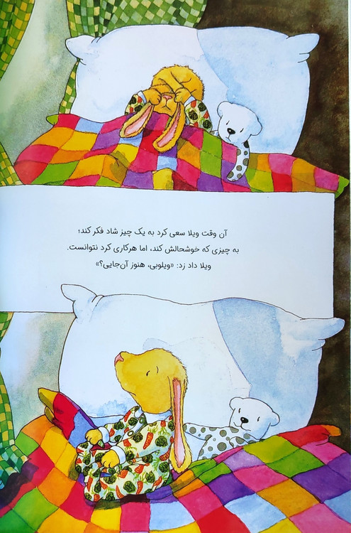 در این داستان، خرگوشی به نام ویلا از اینکه خواب بد ببیند میترسد و نمیتواند بخوابد. او برادر بزرگترش، ویلوبی، را بیدار میکند تا به او کمک کند. ویلوبی با مهربانی به ویلا میگوید: «چطور است به یک چیز شاد فکر کنی؟» آنها با هم به همهی چیزهای خوبی که در انتظارشان است فکر میکنند تا ویلا خوشحال شود و به خواب برود.